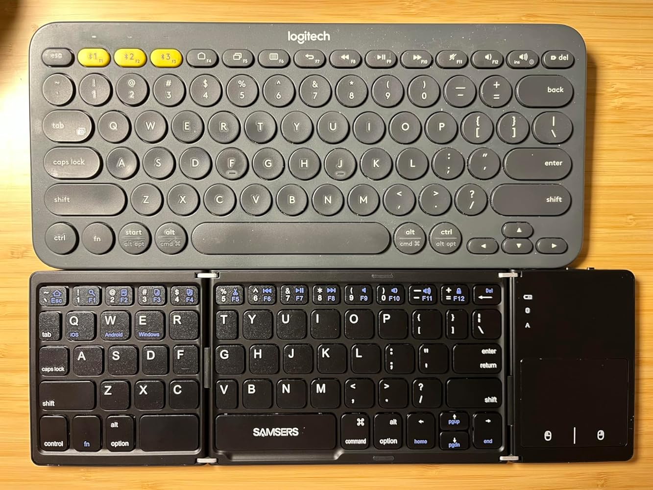 Pros* light, 188 grams when measuring the keyboard alone, great for minimalist travel* folding up makes this compact carry in luggage* usb-c, allowing reuse of usb-c cable instead of carrying another cableCons* Not a full sized keyboard, I am still adjusting from a full sized keyboard* Due to folding, space is split into two keys. Letters ‘t’ and ‘v’ are extra small.* command key is only on right hand side, this makes it more difficult to undo on ios.I included a side-by-side of this with my k380 keyboard. The main reason I got this keyboard is that it’s 188g vs the k380 weighing 400+ grams. I also needed a pointer device on the ipad, in order to be able to draw down formulas in google sheets (web version). With these niche constraints in mind, this is a “perfect” keyboard for the job.